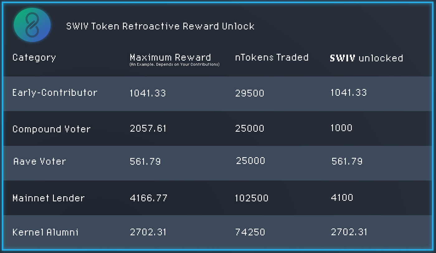 As a way to ensure these community members are represented in our governance, SWIV tokens have been retroactively allocated to these community members based on their proportional contribution.